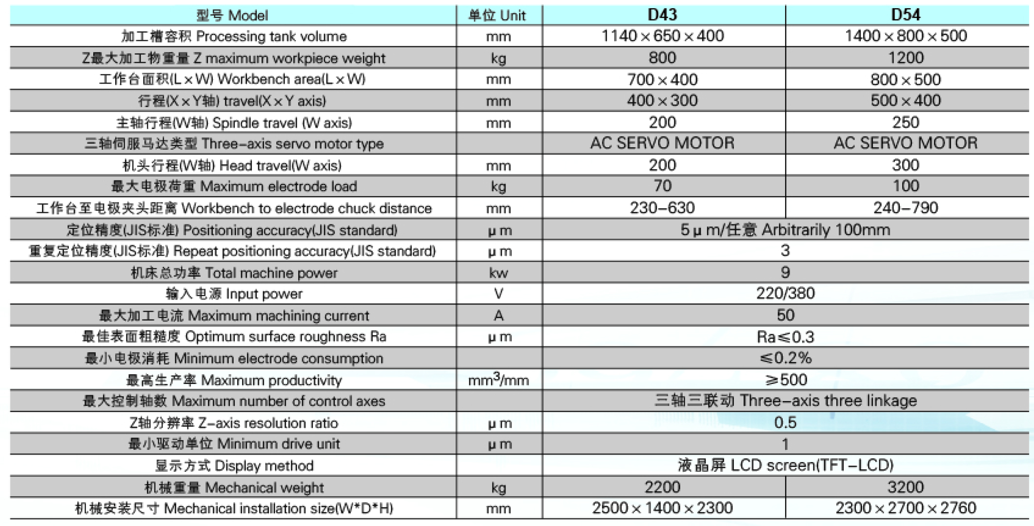可进行电极和工件材料的组合自动加工和手动加工:铜/钢、石墨1/钢、石墨2/钢、铜/铝合金、石墨1/铝合金、石墨2/铝合金、银钨,铜钨/钢、银钨,铜钨/硬质合金、铜/锌合金、石墨/锌合金 、铜/铜合金。
